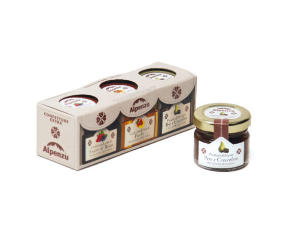 Tris Composto dalle seguenti Confetture extra: Frutti di Bosco, Pesche e Prodotto Dolciario Pere e Cioccolato.